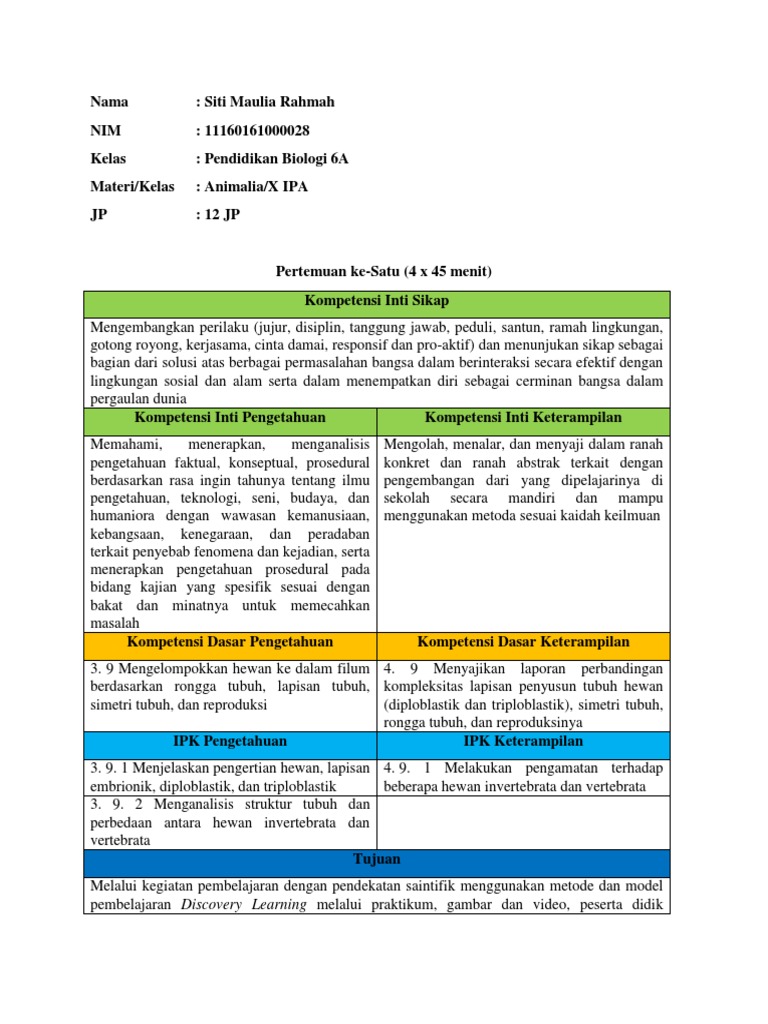 Rpp ANIMALIA kd 3.9 pertemuan 1