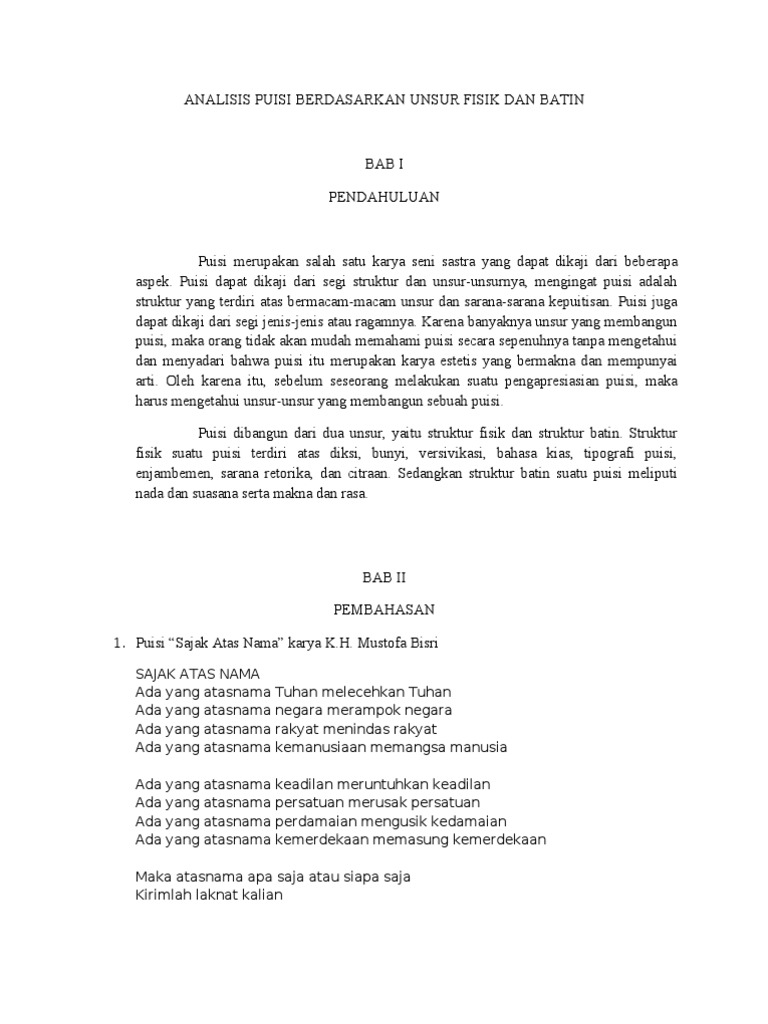 Contoh Puisi Yang Mengandung Struktur Fisik Dan Batin