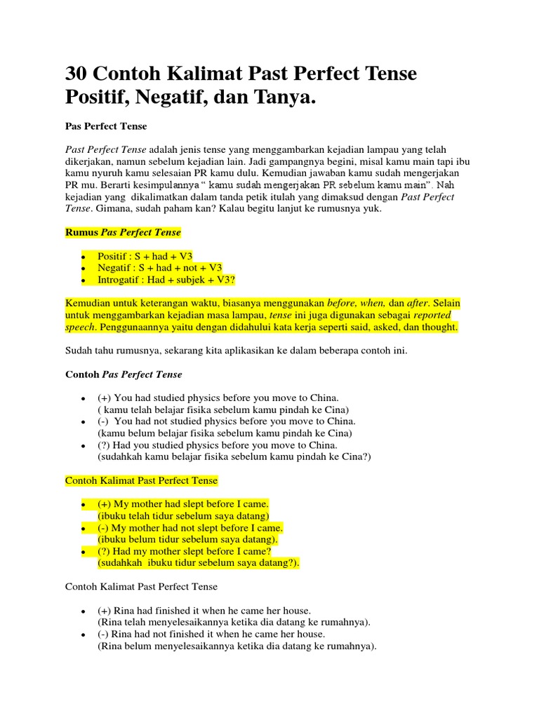 Contoh Kalimat Past Perfect Tense Positif Negatif Interogatif