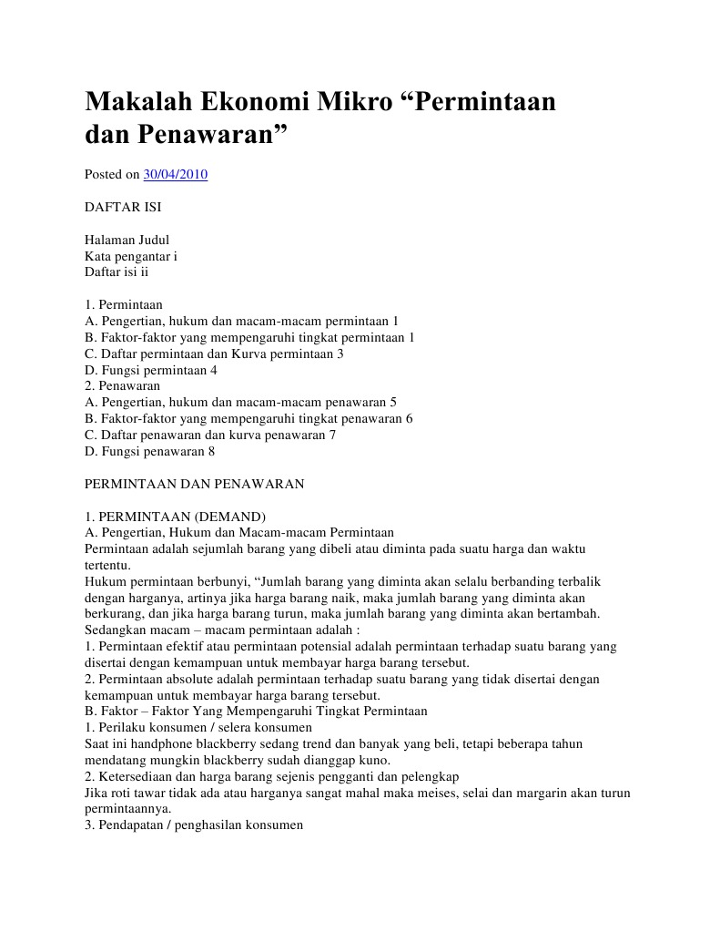 Makalah Ekonomi Mikro Tentang Permintaan Dan Penawaran Pdf - Contoh Makalah