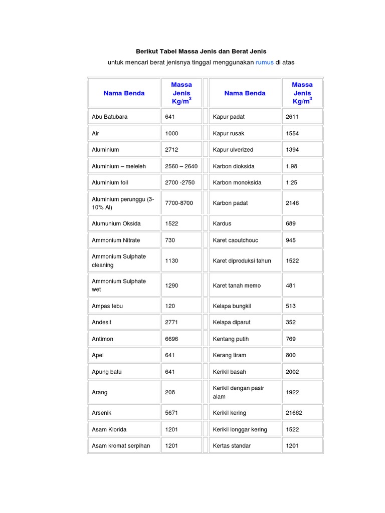 Tabel Massa Jenis Dan Berat Jenis