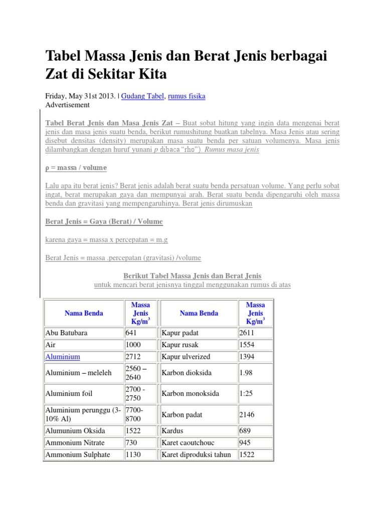 Tabel Lengkap Density, Berat Jenis, Massa Jenis Aneka Macam Benda …
