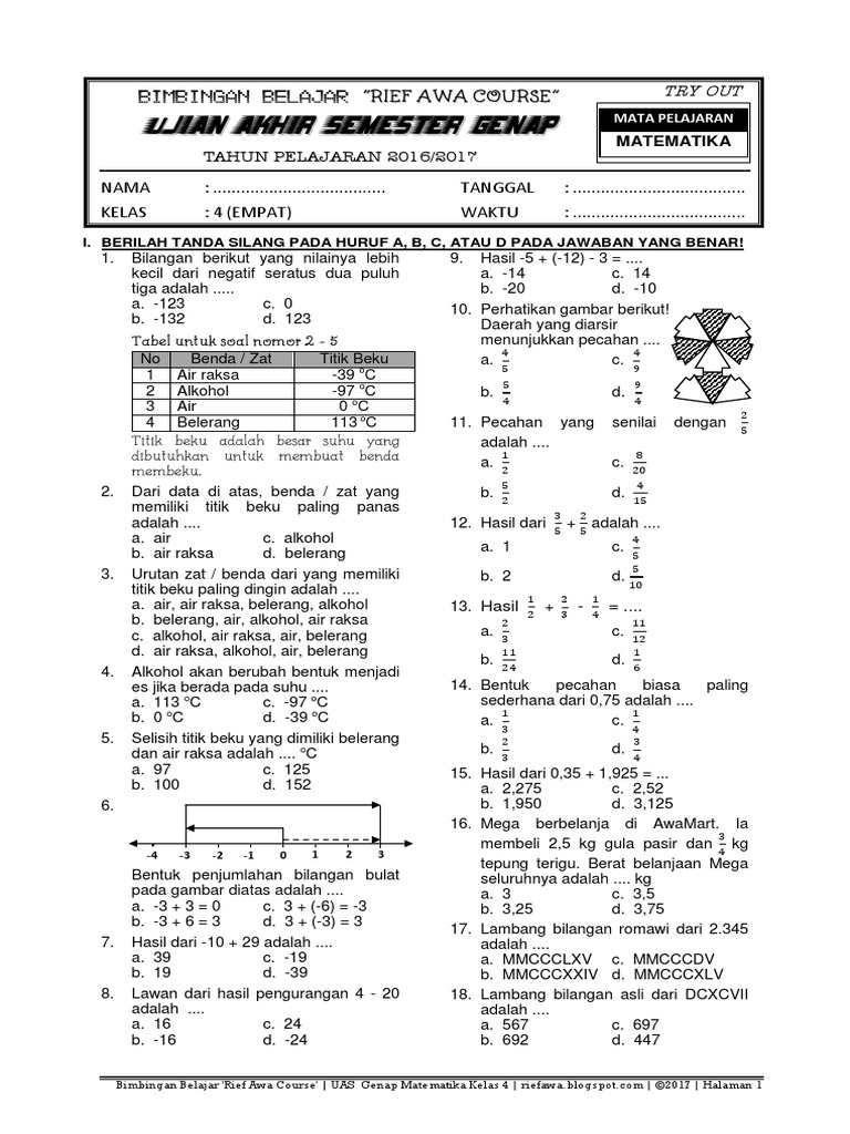 Soal uts matematika kelas 4 semester 2 kurikulum 2013 - antapedia.com