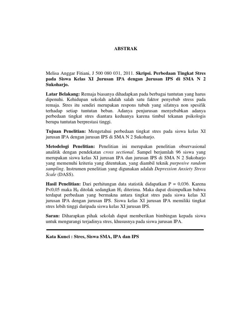 PERBEDAAN TINGKAT STRES PADA SISWA KELAS XI JURUSAN IPA DENGAN JURUSAN IPS Perbedaan Tingkat Stres Pada Siswa Kelas XI Jurusan IPA Dengan Jurusan IPS di SMA N 2 Sukoharjo.