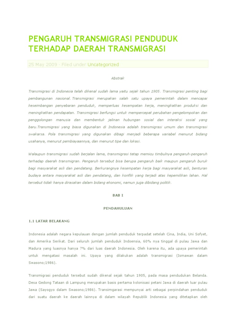 Pengaruh Transmigrasi Penduduk Terhadap Daerah