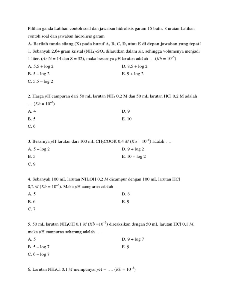 Pilihan Ganda Latihan Contoh Soal Dan Jawaban Hidrolisis Garam 15 Butir