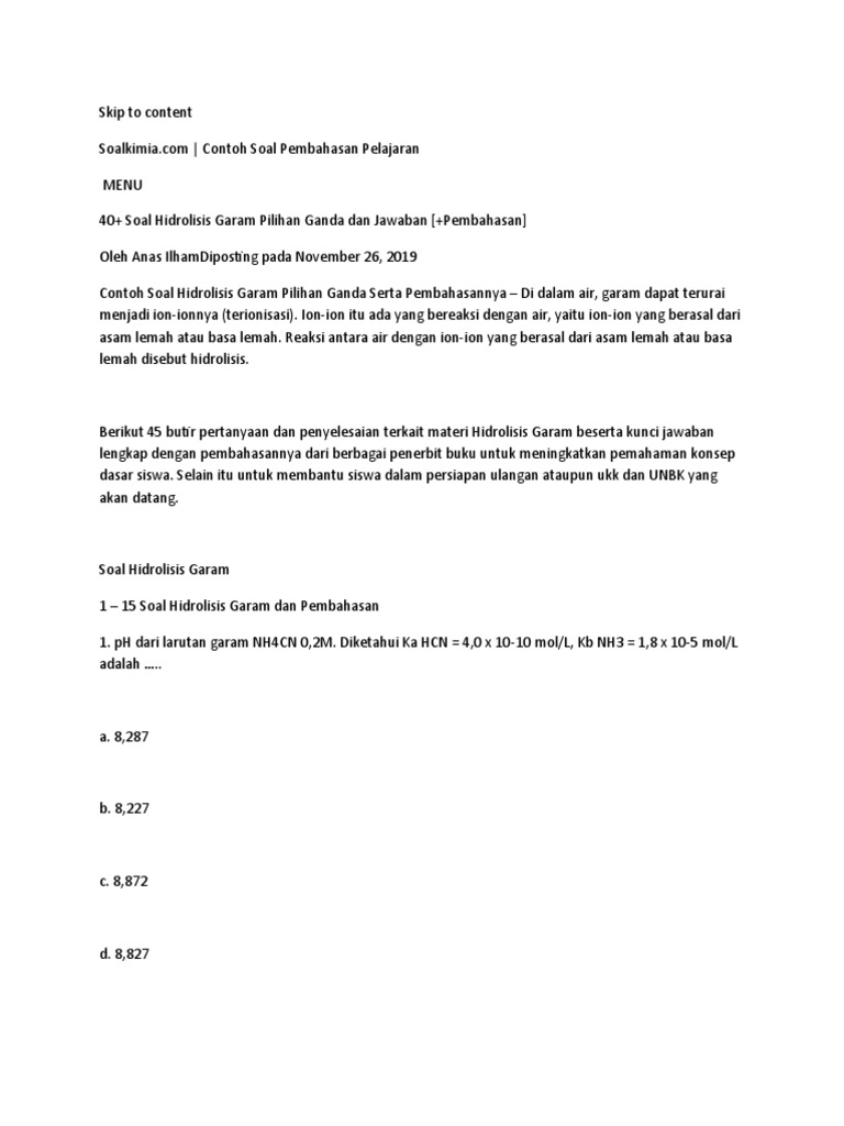 Contoh Soal Pilihan Ganda Dan Pembahasan Hidrolisis – IlmuSosial.id