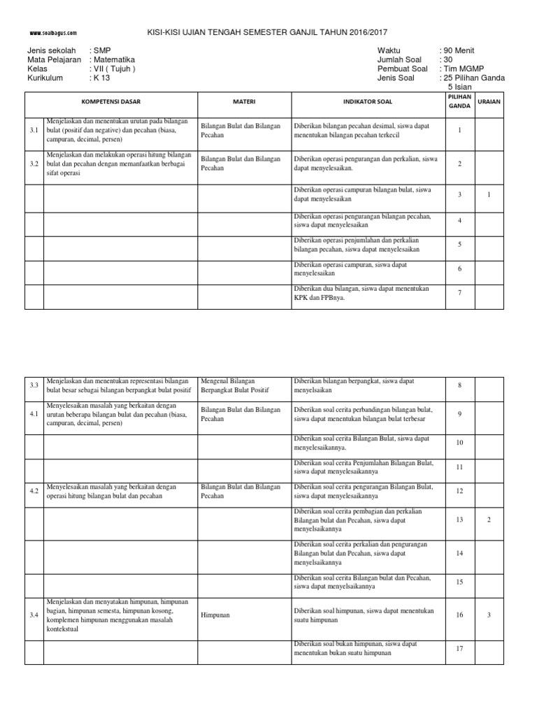 Soal Matematika Kelas 7 Kurikulum 2013 Semester 2