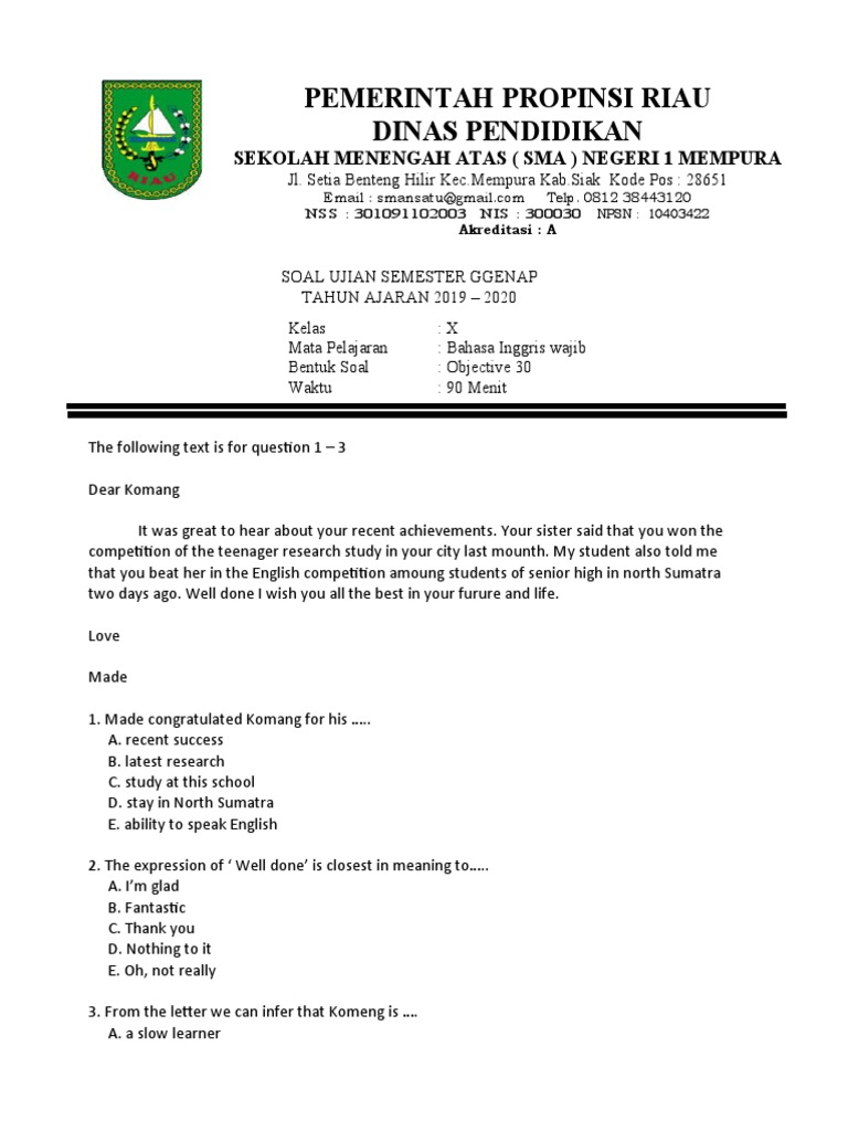 Soal USBN Bahasa Inggris SMA 2020 - Rizsafa | Informasi Pendidikan| Informasi Pendidikan