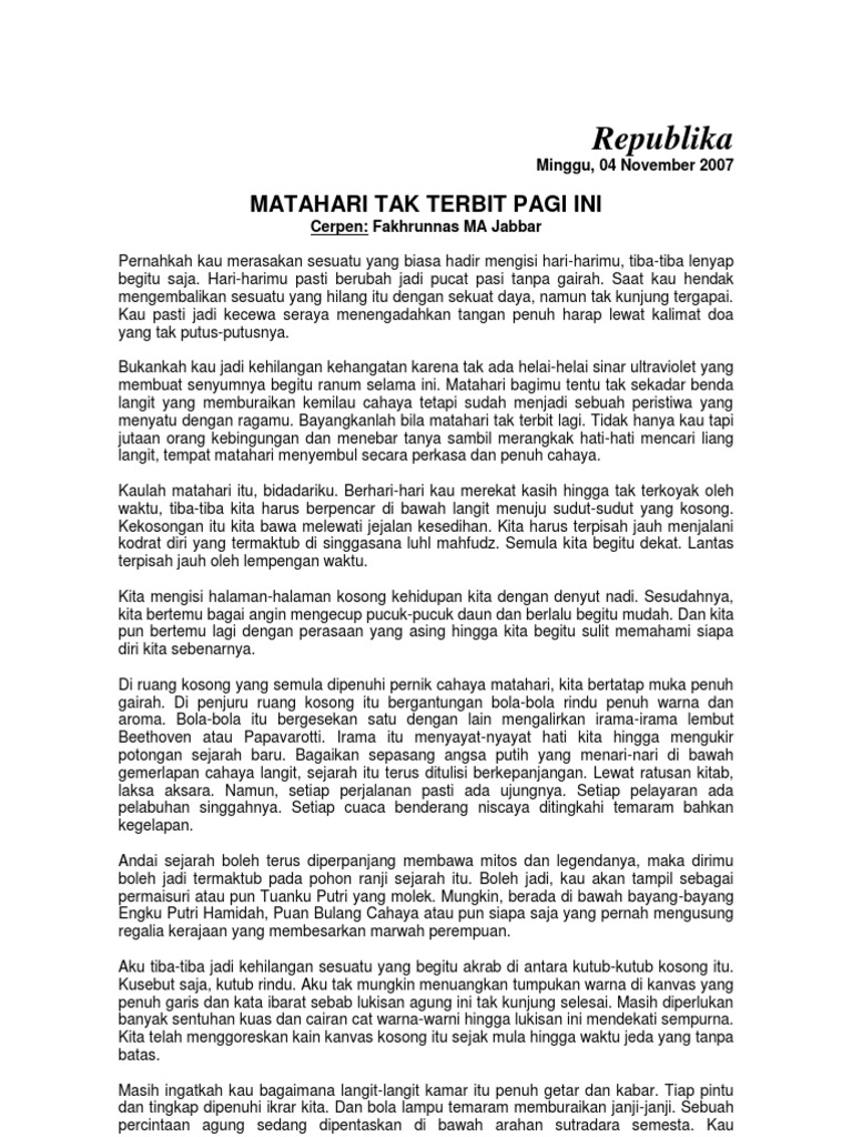 Kumpulan Cerita Lucu: unsur intrinsik cerpen matahari tak terbit pagi ini karya fakhrunnas ma jabbar