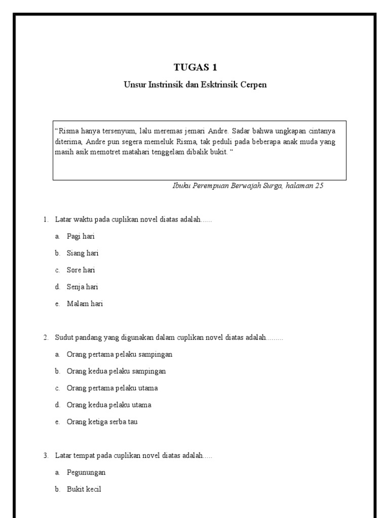 1. Unsur intrinsik tersebut adalah … a. Alur dan latar b. Alur …
