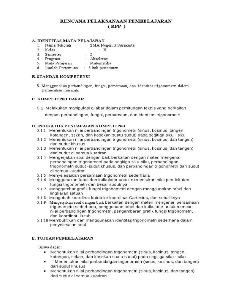 Rpp Kelas x Semester 2 Materi Trigonometri